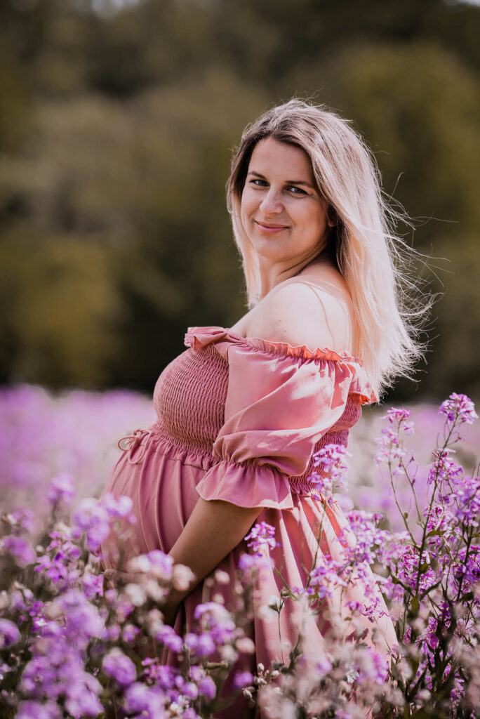 Babybauchfotografie im Blumenfeld. Eine werdende Mutter im Schwangerschaftskleid hält eine Blume vor ihren Bauch.